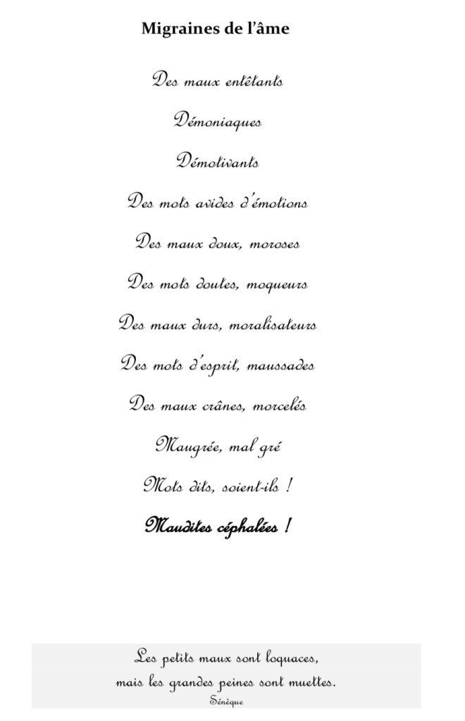 Déjouer les maux entêtants, en les détournant, que du bon sens ! Ce jeu console bien des âmes, surtout celles si sensibles à la musique des mots. Une dose de poésie et quelques traits d’esprit, c’est l’élixir rêvé pour soigner ces maudites céphalées. C’est tout le propos de cet ouvrage en prose, qui propose une invitation au voyage, dans une oasis au milieu du plus beau des déserts, celui empli de vers et de chimères, au parfum de mystère. Triste, dense et beau. Suivez son tempo et entrez dans sa danse des mots dans Migraines de l’âme
