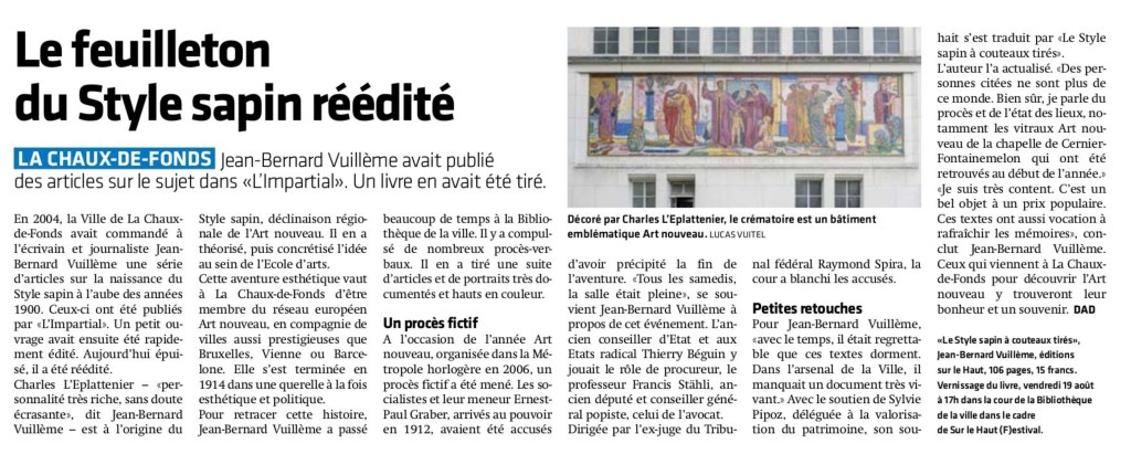 Entre 1905 et 1914, La Chaux-de-Fonds a vécu une aventure esthétique hors du commun qui lui permet aujourd’hui d’avoir sa place dans le Réseau européen Art nouveau, en compagnie de villes aussi prestigieuses que Bruxelles, Vienne ou Barcelone. Que s’est-il passé? Charles L’Eplattenier, un «homme des bois», selon l’expression de son élève Charles-Édouard Jeanneret (Le Corbusier), a initié ce mouvement au sein de l’École d’art. Il a créé une déclinaison régionale de l’Art nouveau appelée le Style sapin. Mais cet élan s’est brisé en 1914 et la belle aventure s’est achevée dans une querelle à la fois esthétique et politique entre les «anciens» de l’Ancienne section et les «nouveaux» de la Nouvelle section. L’écrivain et journaliste Jean-Bernard Vuillème a raconté cette histoire dans une suite d’articles et de portraits très documentés et hauts en couleur parus dans L’Impartial(actuel Arcinfo) entre 2004 et 2006. Ils n’ont pas pris une ride.