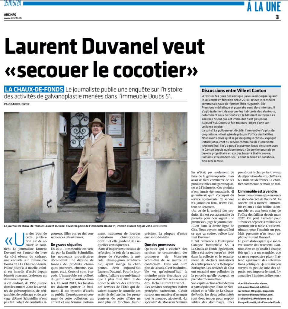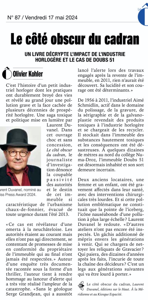 Héroïne de cet ouvrage, une maison polluée, située rue du Doubs 51 dans une cité horlogère jurassienne. À La Chaux-de-Fonds, les ateliers de production de montres sont partout, des sous-sols aux combles, en passant par les cuisines.