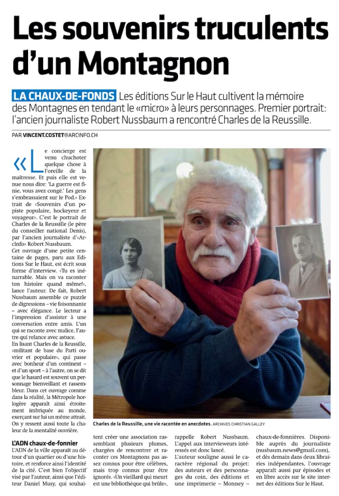 Quel plaisir d’avoir pu rendre visite à Charles De La Reussille dans son petit deux-pièces chaux-de-fonnier de la rue du Pont ! Semaine après semaine pendant plusieurs mois, il nous a ouvert amicalement sa porte et la fenêtre de ses souvenirs de fringant octogénaire.